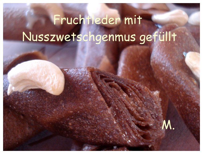 Fruchtwraps werden mit Nuss-Zwetschgenmus gefüllt, zusammengerollt und in Stücke geschnitten.