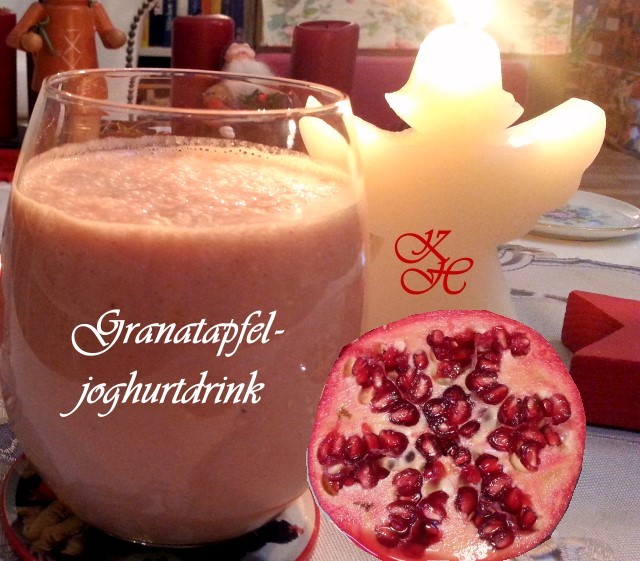 Für diesen köstlichen Adventsdrink, den ich in dieser Zeit des Öfteren zubereite, mixe ich den Saft eines Granatapfels, eine halbe gut gereifte Kakifrucht, Wasser,